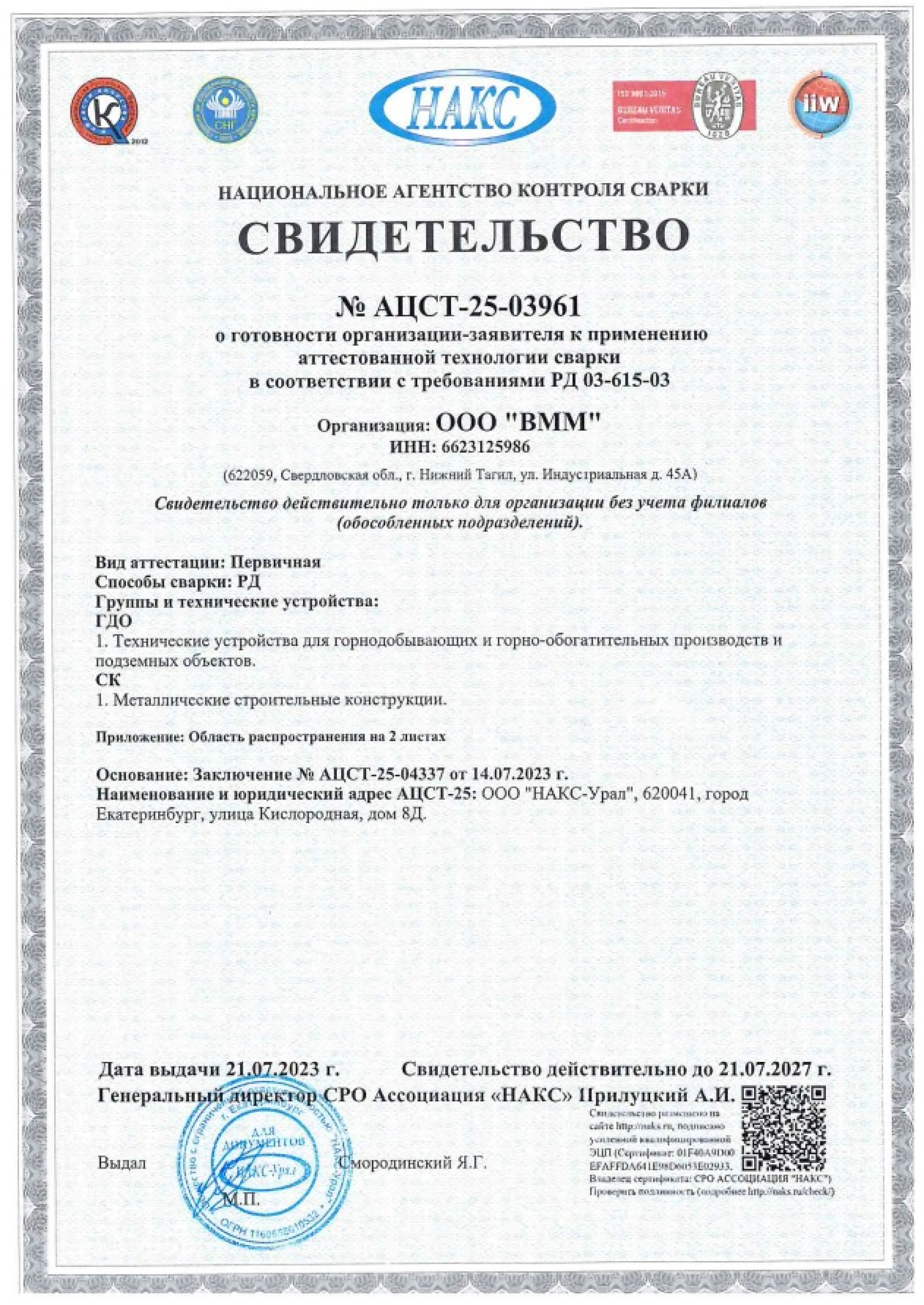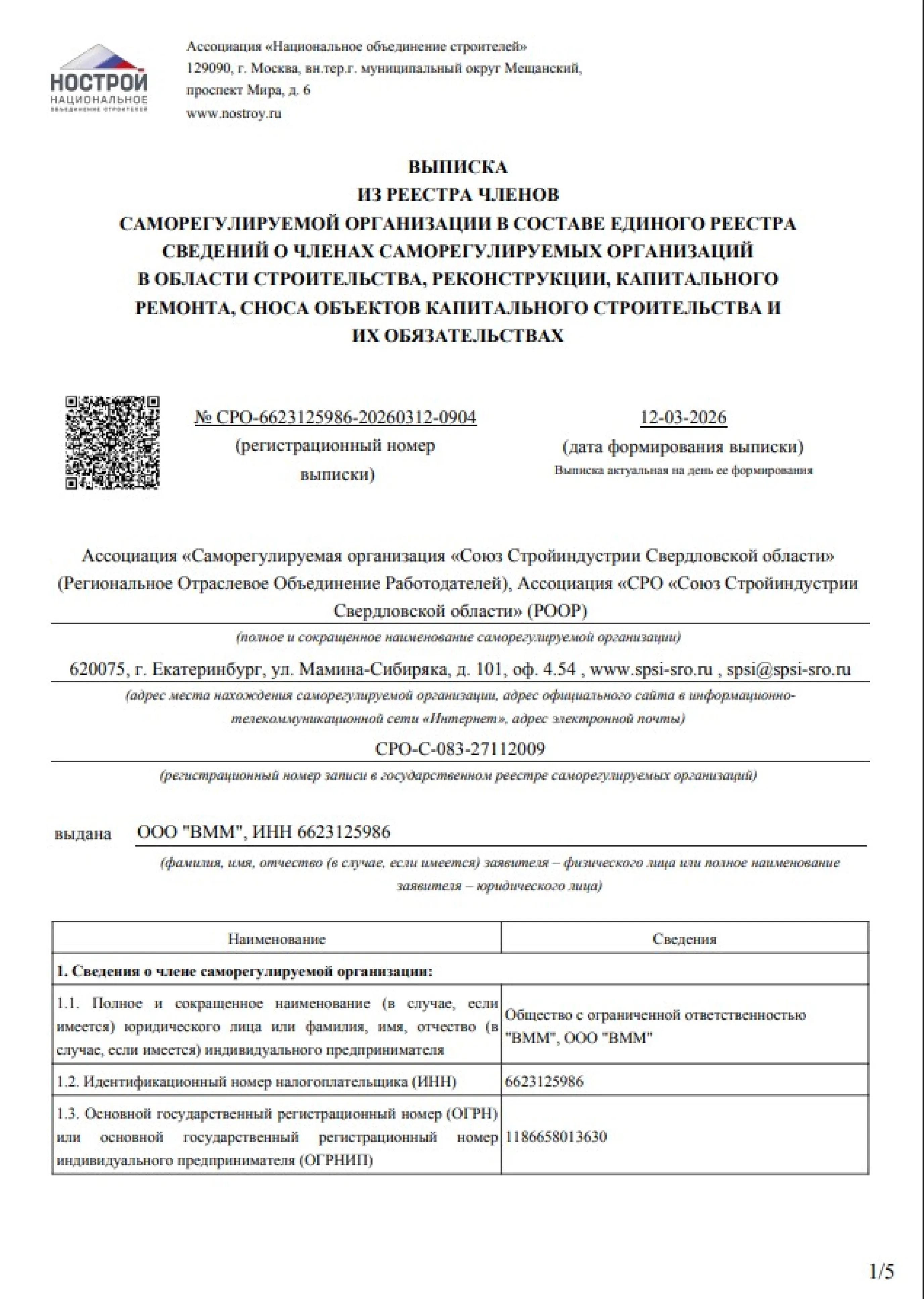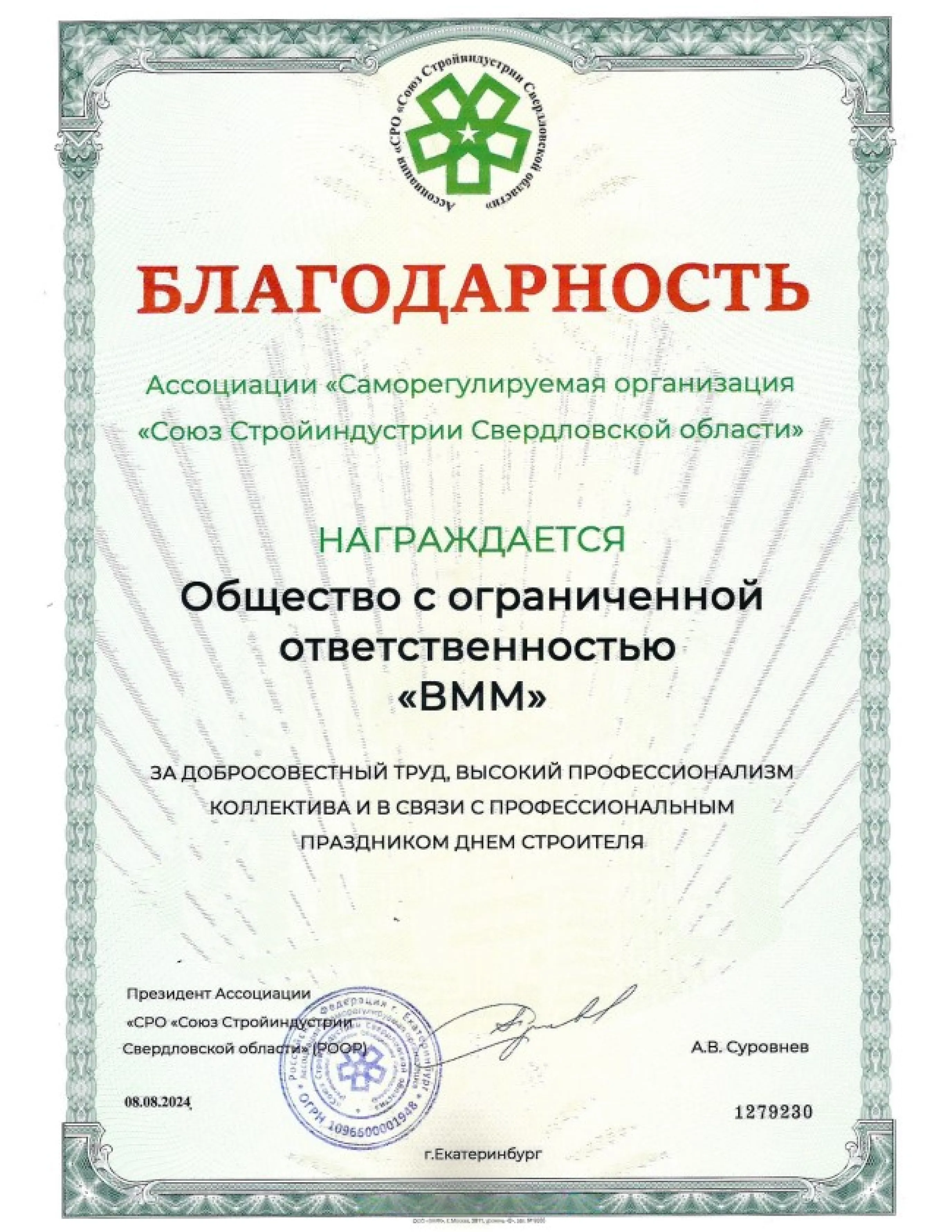 Статус ООО «ВММ» как ответственного подрядчика подтвержден членством в Ассоциации «СРО «Союз Стройиндустрии Свердловской области» с третьим уровнем ответственности. Мы можем выполнять строительный подряд до 3 миллиардов рублей по одному контракту.